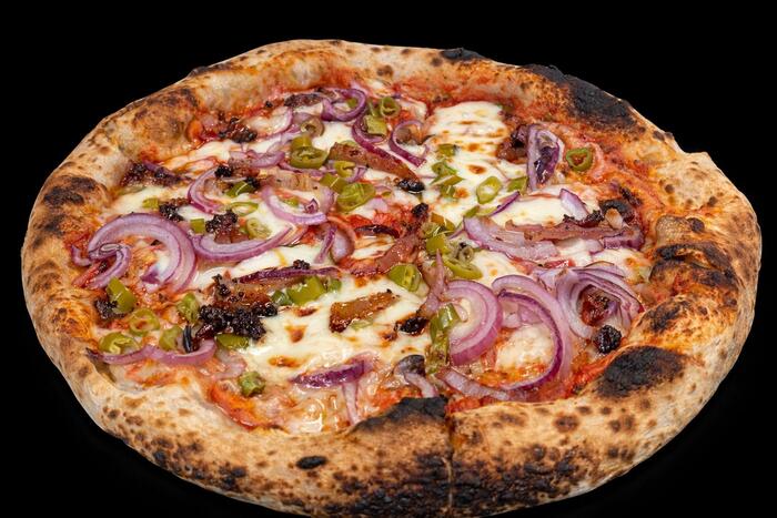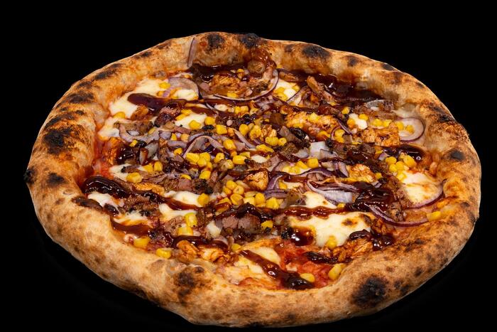 sos pomidorowy, mozzarella, kurczak, guanciale, cebula czerwona, kukurydza, słodko-pikantne BBQ
