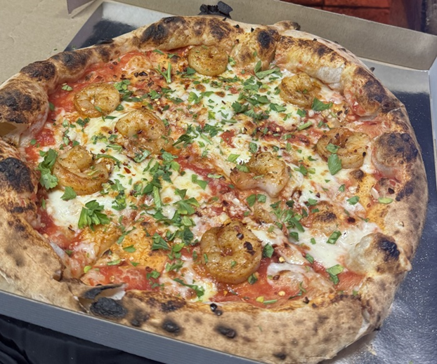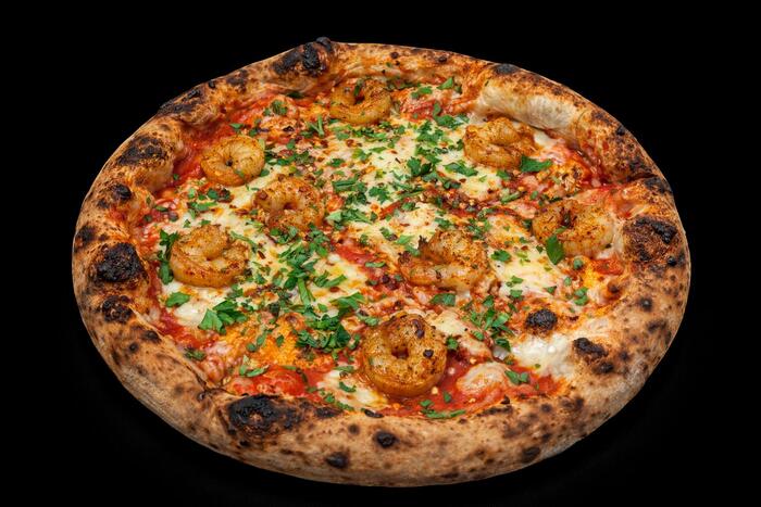 sos pomidorowy, mozzarella, krewetki, czosnek, natka pietruszki, płatki chilli