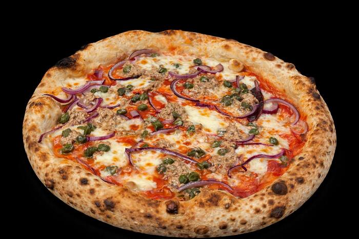 sos pomidorowy, mozzarella, tuńczyk, kapary, cebula czerwona