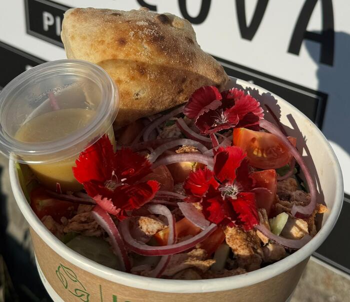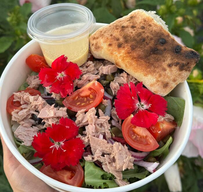 mieszanka sałat, tuńczyk, pomidorki cherry, cebula czerwona, oliwki czarne, kapary, dressing cytrynowo-musztardowy, bułeczka