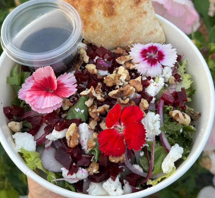 mieszanka sałat, burak, kozi ser, orzechy włoskie, cebula czerwona, dressing balsamiczny, bułeczka