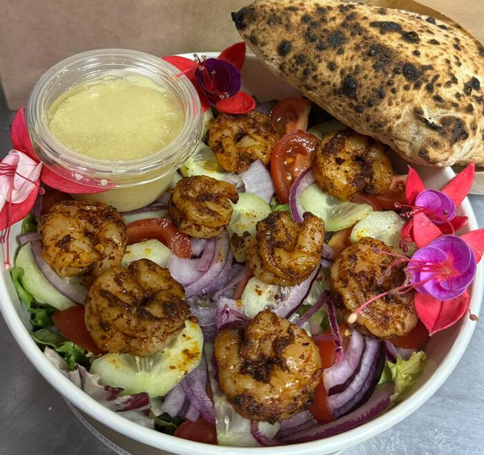 mieszanka sałat, krewetki, pomidorki cherry, cebula czerwona, ogórek, dressing cytrynowy, bułeczka